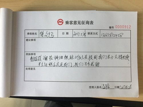 2017年5月28日,花橋站收到了一封來自乘客徐先生的感謝信,信上徐先生對我們車站工作人員認真負責的態度表示肯定以及由衷的謝意。