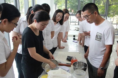 在會議室進行簡單的交流后,大家齊聚于布置完畢的食堂內,一邊聽著糕點師傅講解制作月餅所需注意的要點,一邊親自動手和面、拌餡、制作月餅。隨后,糕點師傅將大家做好的月餅刷涂蛋黃液并放入烤盤內烘烤,十五分鐘后,烘烤完畢的月餅新鮮出爐,員工們紛紛體驗到了親自制作月餅的喜悅。
