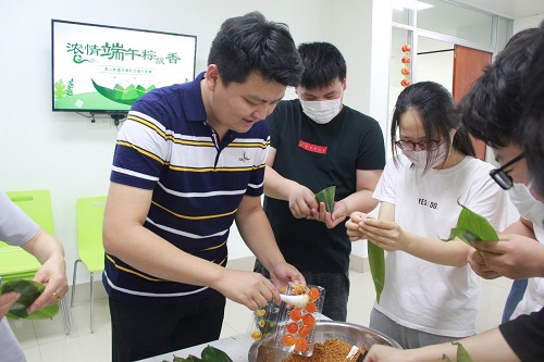 活動前期進行了泡糯米、剪粽葉、腌豬肉等食材的精心準備,老師現場演示、傳授、講解包肉粽子的秘訣、技巧和步驟。經過卷粽葉、加肉、包糯米、掩口、裹緊等流程,最后蒸煮出鍋……翠綠的粽葉,晶瑩的糯米,就變成了一個個噴香誘人的粽子。品嘗著自己包的美味粽子,員工們興奮之情溢于言表。
