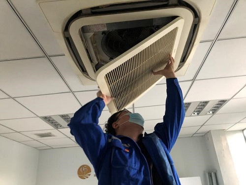 場地清空后,師傅將空調濾網從新風機內抽出,先將表面附著的臟東西掃掉,然后用清水對濾網清洗直到濾網干凈為止,再將洗干凈的濾網用稀釋過的84消毒水消毒,消毒后對清洗干凈的濾網進行晾曬。當濾網干后,檢查濾網是否清潔、表面有無污物和灰塵,濾網孔眼是否通透,無堵塞,確認沒有問題后進行安裝。