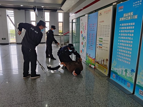 上午十點左右,車站警務站站長正式通知各崗位人員就位布置演練場景,演練主要模擬花橋站站廳東端有嫌疑人想點燃易燃品,東端客服中心工作人員發現后立即通知值班站長及駐站警務人員。駐站警務人員和值班站長接到信息后立即到達現場,并聯合安檢、保潔等車站工作人員將嫌疑人順利制服。
