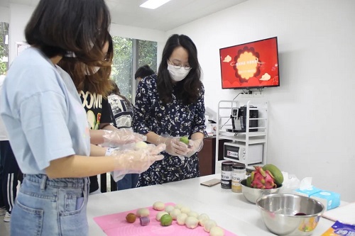 糕點師傅現場傳授了月餅的制作方法,稱重、揉面團、包餡、放模具按壓成型……大家分工協作,互相配合,邊動手邊交流佳節故事,分享心得體會,其樂融融。最開始不太熟練,部分月餅有“露餡”的情況,但是大家立刻總結經驗,準確掌握餅皮和餡料的重量,細心搓圓,逐個過秤,再由具有廚房經驗的成員包制,小心細致印花,一邊相互探討,一邊按照講解的方式進行制作,漸漸的,一盤又一盤香噴噴的月餅出爐了,大家看著自己做出的月餅,興奮不已。